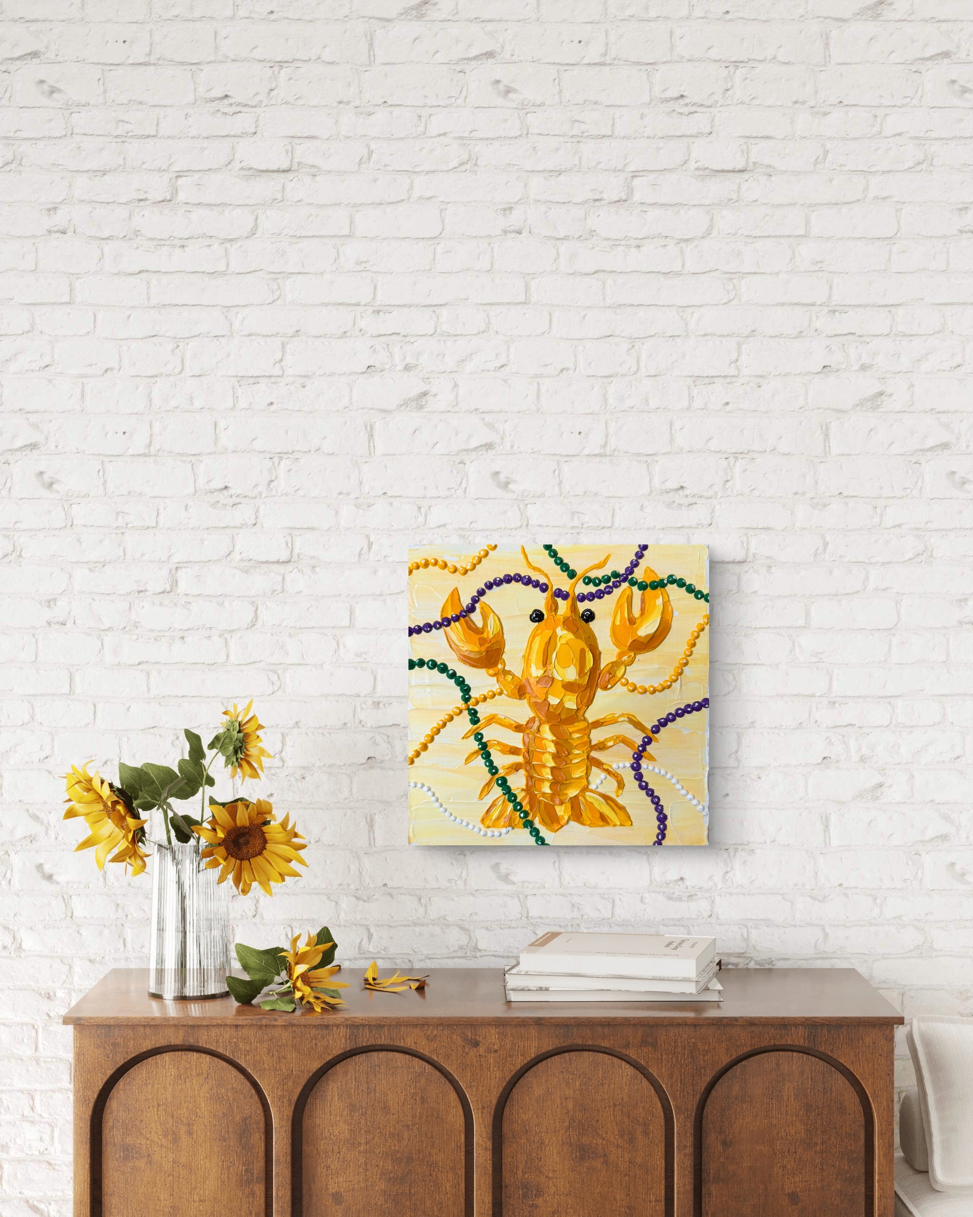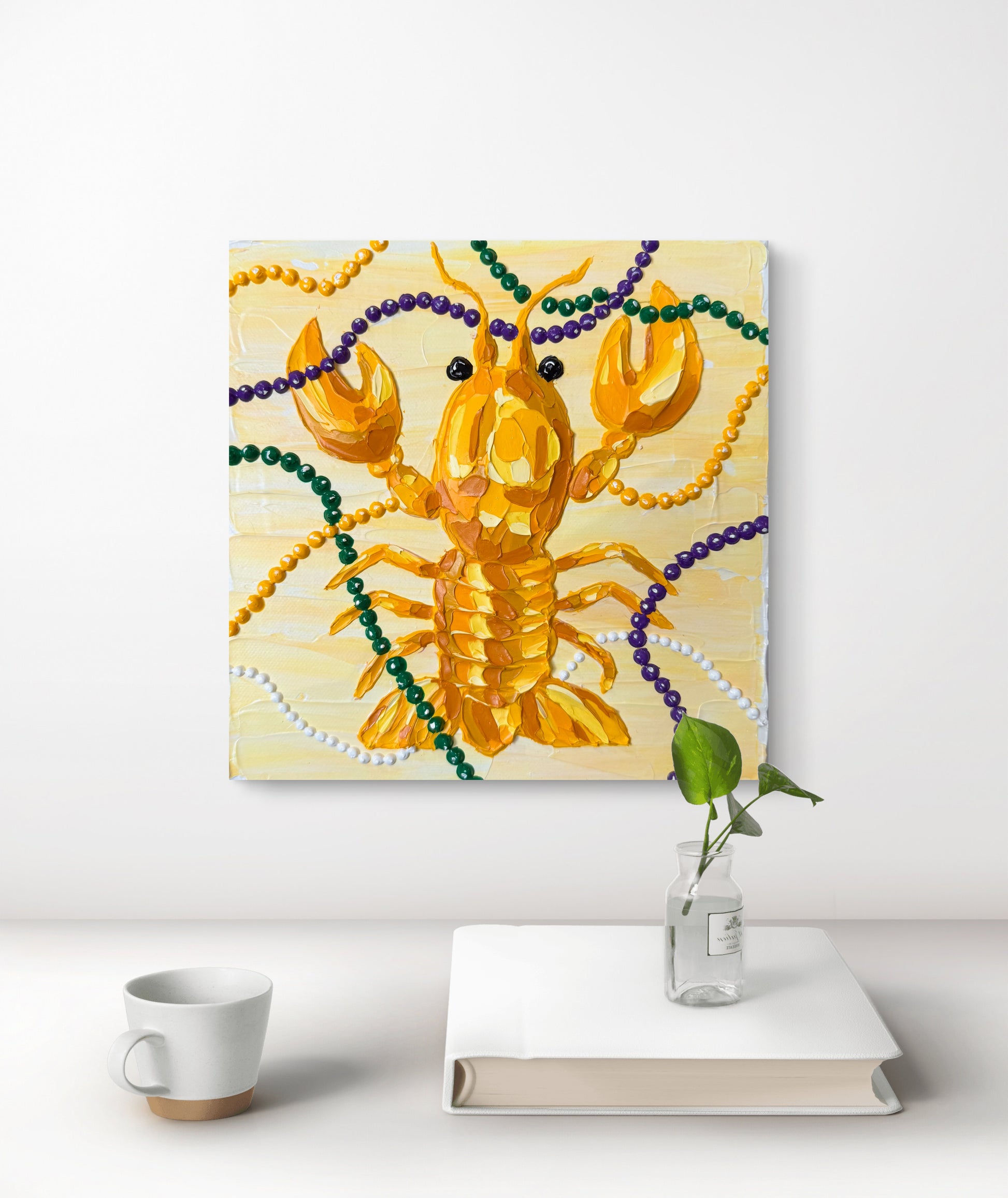 Carnival Crawfish – Gold is a luminous, celebratory 8x8" mini painting inspired by the warmth and richness of Mardi Gras traditions. Painted in golden yellow tones with thick, expressive palette-knife texture, this crawfish radiates energy and joy.