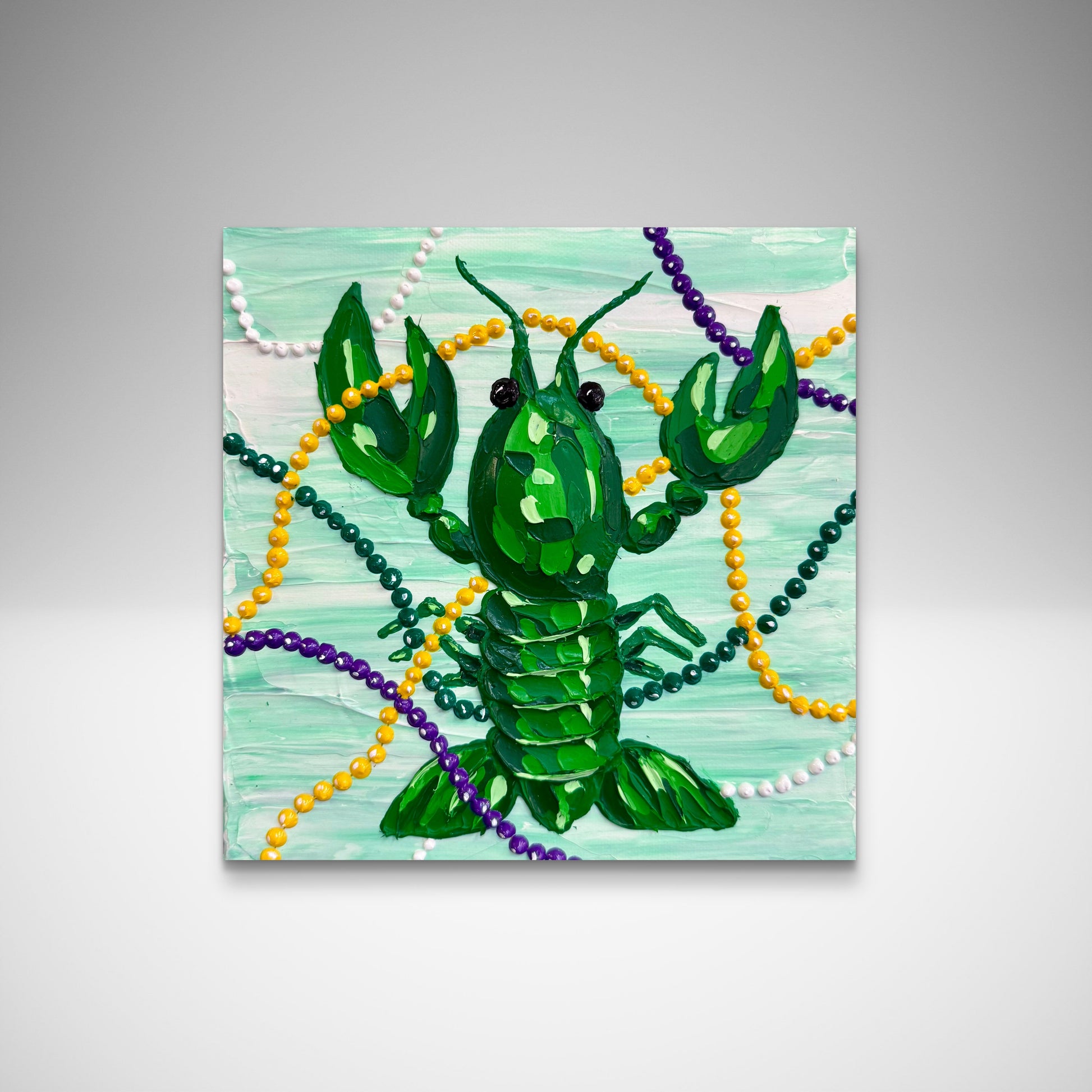 Carnival Crawfish – Green celebrates the energy of Mardi Gras through vibrant emerald tones and playful beadwork. This original 8x8” painting captures the iconic Louisiana crawfish with thick palette-knife strokes and dimensional texture.