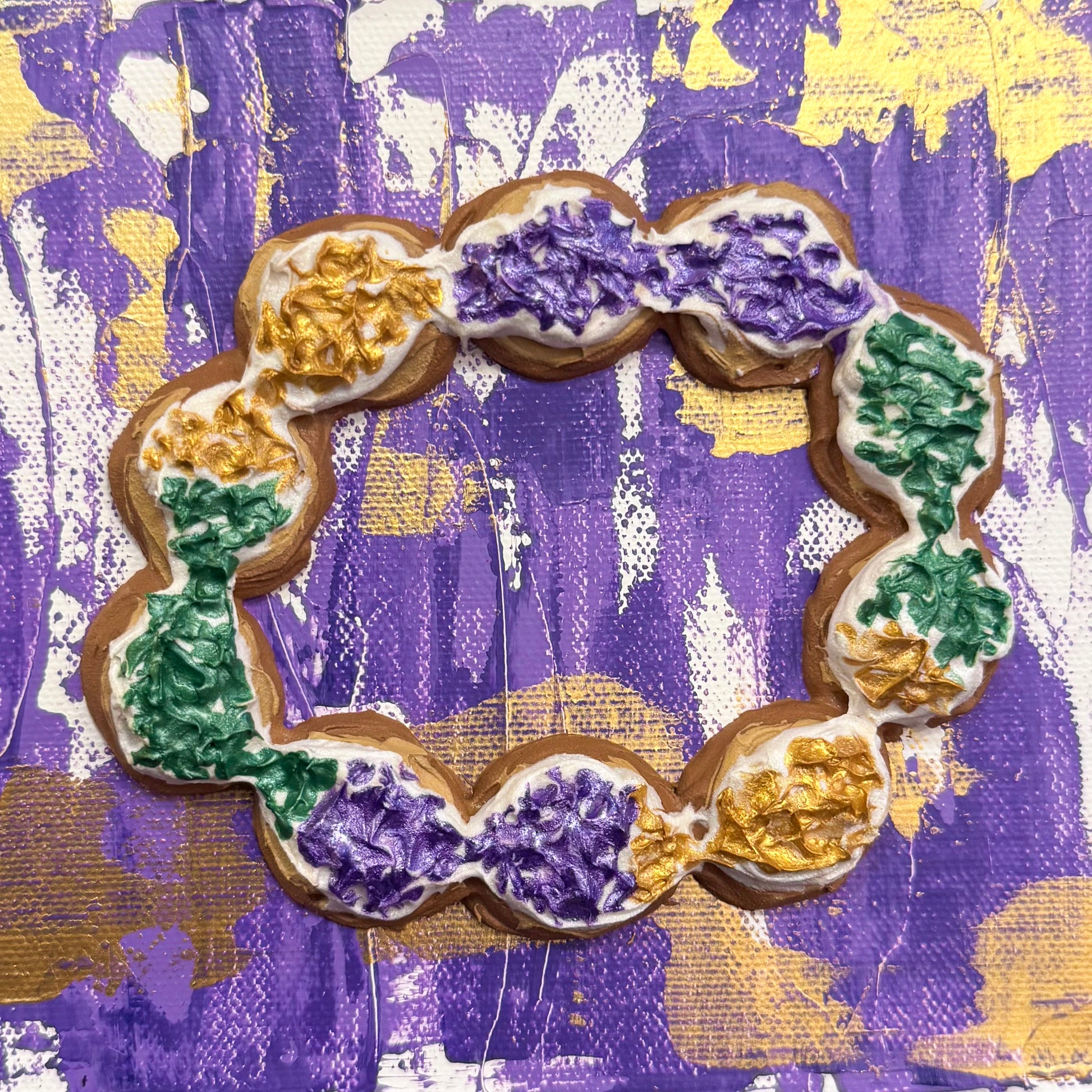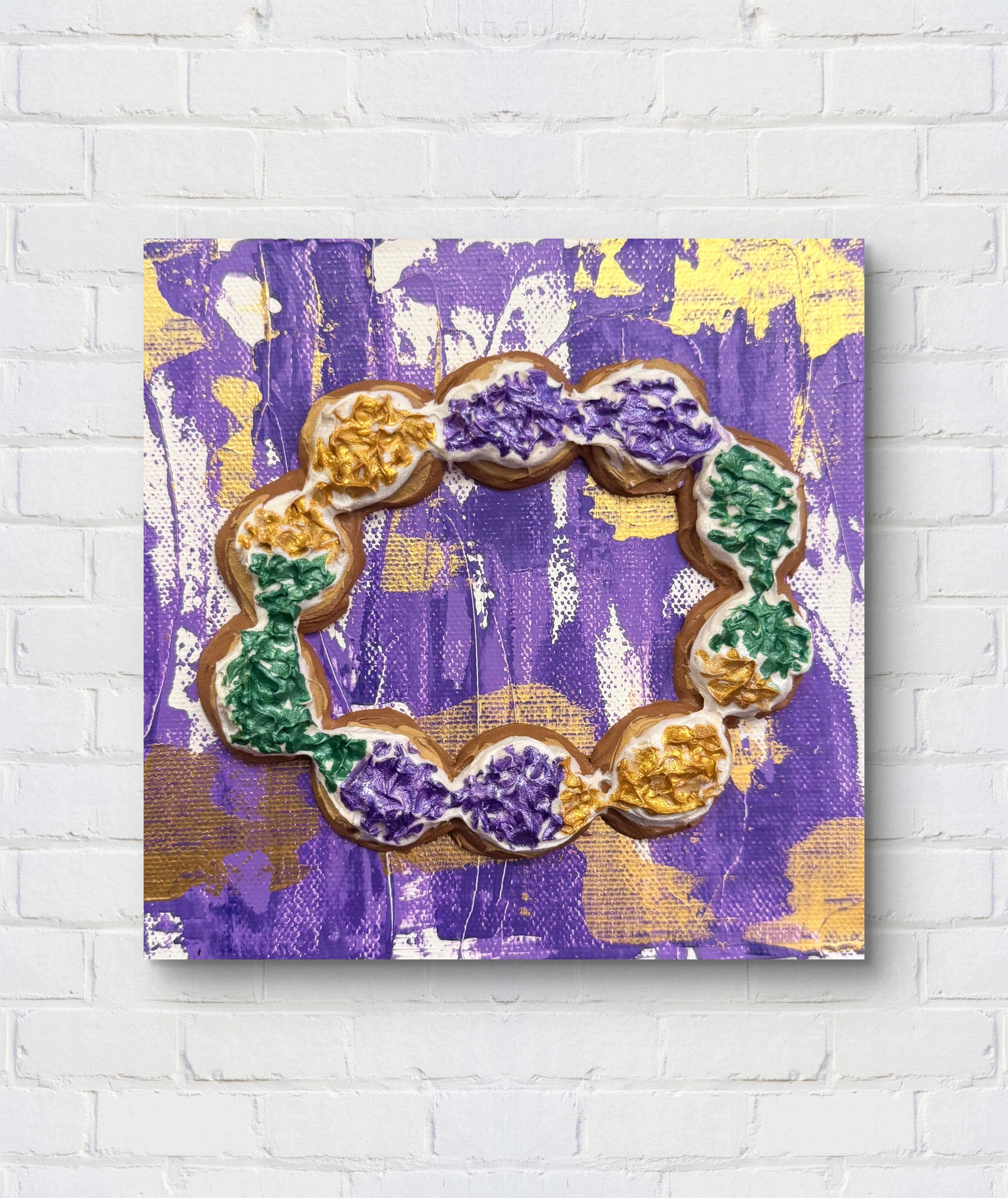 King Cake – Purple is a 6×6" original textured acrylic painting celebrating the joy of King Cake season during Mardi Gras. Accented with purple, gold, green, this collectable mini was inspired by New Orleans tradition and created as a one-of-a-kind original.